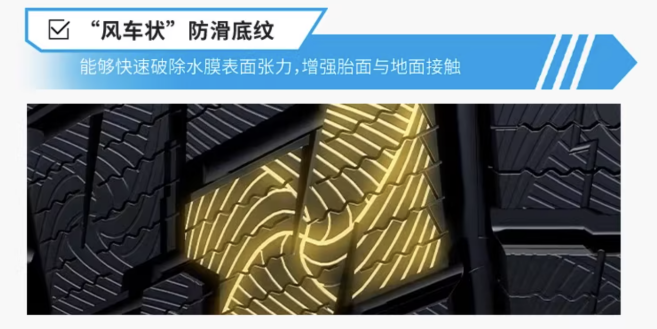 针对冰雪天路况,佳通冬季舒适WT26采用能主动吸除冰面水膜的“海绵软胶2.0技术”, 结合“风车状”防滑底纹破除水膜张力,从而提升刹车响应效率。