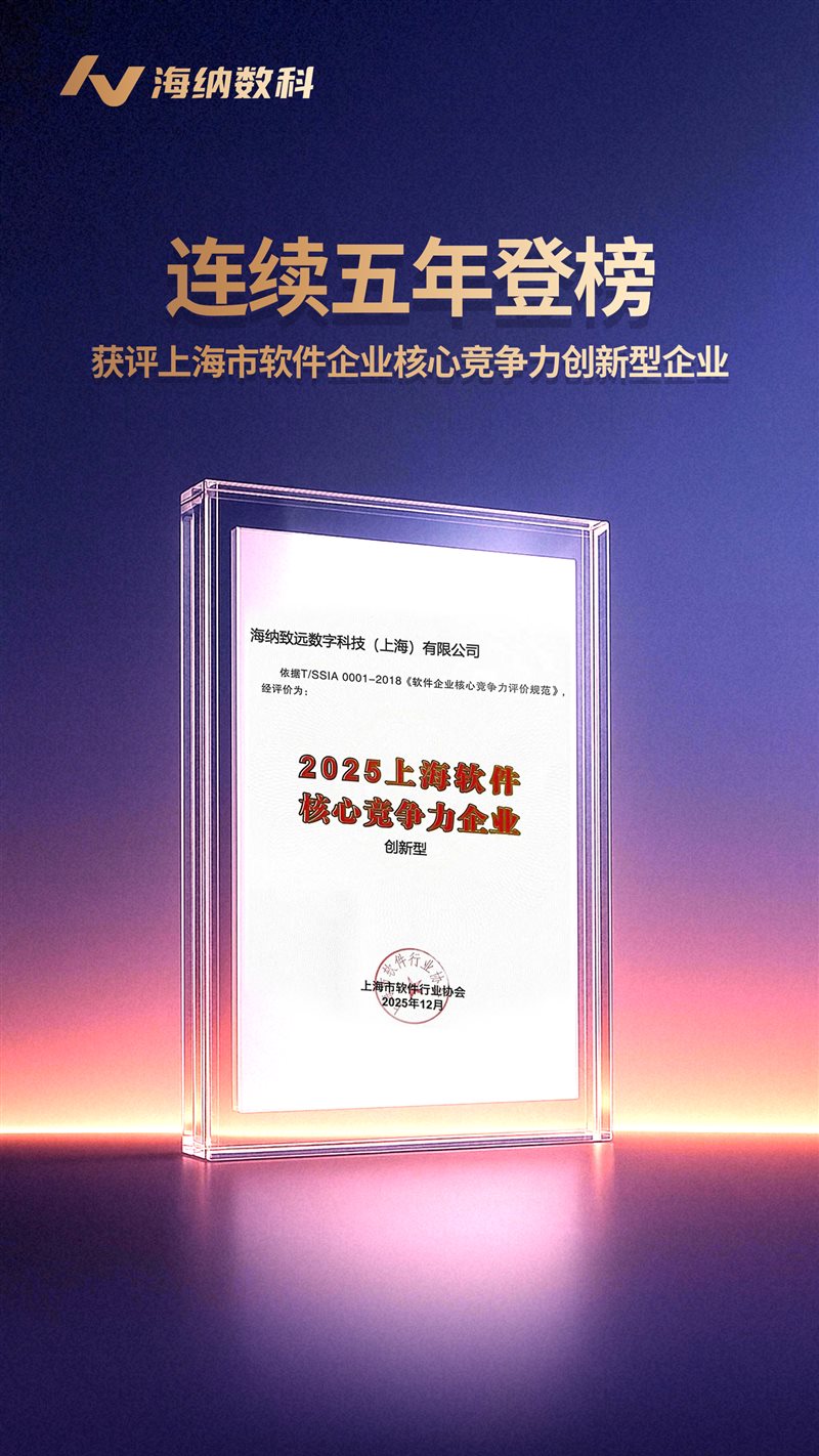 12月18日,在上海市软件行业协会召开的“2025上海软件创新论坛暨八届十五次理事会”上,《2025上海市软件企业核心竞争力评价报告》正式发布。海纳数科凭借技术创新实力及高质量发展成果,成功入选“2025上海软件核心竞争力创新型企业”。值得关注的是,这是海纳数科连续第五年荣登该榜单,实力彰显在软件与数字化领域的深厚积淀。