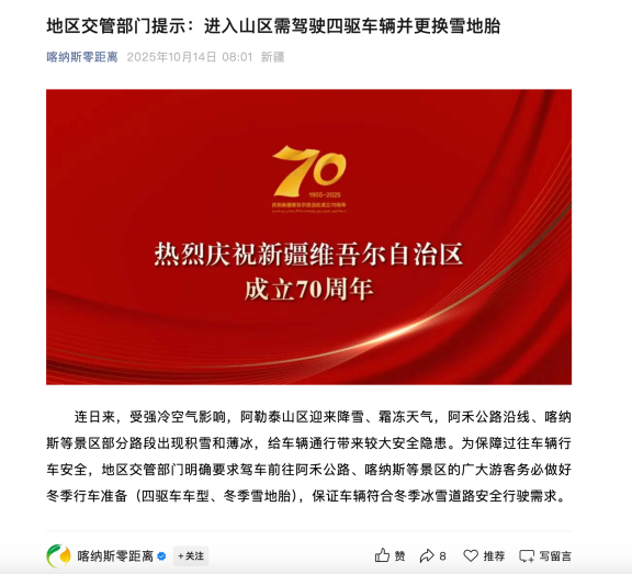 又是一年冬景时,壮丽山河在远方召唤。但需要提醒有自驾打算的车友,出发前记得了解当地路况。近日阿勒泰地区公安局喀纳斯景区分局交通管理大队就明确警示,在冬季前往景区及周边区域的车辆必须提前配备并安装合格的雪地胎,确保冰雪路面行车安全。