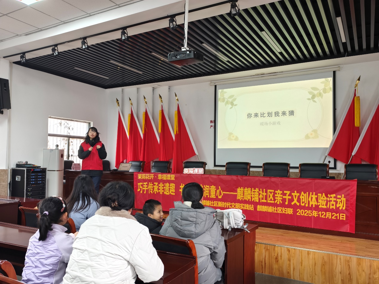 为深化家庭文明建设,提升亲子陪伴质量,引导家庭在文化体验中实现共同成长,12月21日上午,麒麟铺社区新时代文明实践站在麒麟铺社区活动室开展茉莉花开·幸福课堂亲子文创体验活动。活动以“亲子共学·文化润心”为主线,通过家庭教育引导、阅读心愿书写与文物文创体验等多元环节,打造兼具教育意义与文化温度的亲子互动空间。