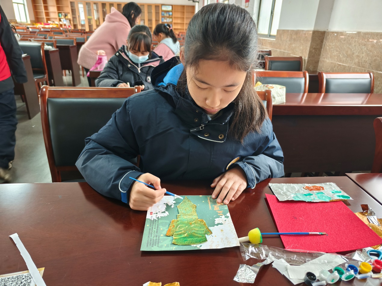 随后开展的文创体验环节聚焦文物与传统工艺。社区志愿者从博物馆文物保护与呈现切入,引导亲子家庭认识非遗技艺在文化传承中的重要意义。亲子家庭共同参与文物锡纸摹画制作,通过动手刻画与细节塑形,孩子们化身“小小工匠”,在实践中感知传统工艺作为非遗的纹理与质感。活动最后,社区志愿者对整场活动进行简要回顾,亲子家庭展示完成的文物摹画作品与阅读心愿卡,并合影留念,为本次文化体验活动画上圆满句号。