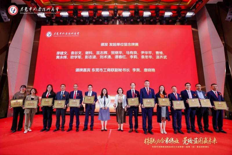 隆重的表彰环节,将感恩之情推向高潮。在东莞市工商联副秘书长李爽、唐晓艳及株洲攸县、芦淞区、醴陵市工商联领导的见证下,十六家发起单位获颁留念牌匾,六十余位在商会成立过程中做出卓越、杰出、爱心贡献的个人与单位依次上台受奖。热烈的掌声,不仅是对过往付出的最高肯定,更是对同舟共济精神的最好诠释。