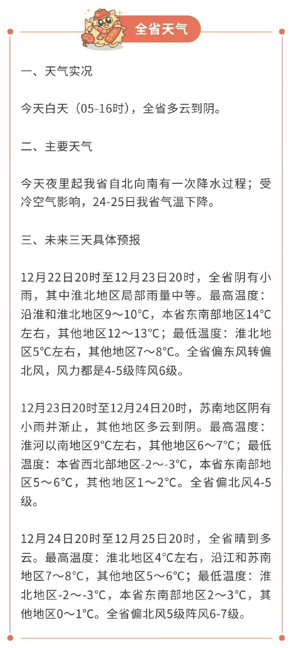 交汇点讯 冬至刚过,江苏天气便开启“冷暖反转”模式,短暂升温后,两轮冷空气将接连登场,带来明显降温和大风天气,部分地区还将伴随小雨,寒意持续升级。12月22日全省以多云到阴为主,下午2时,沿江及以南地区气温在9~11℃,其他地区普遍6~9℃,较昨天同一时刻小幅回升1~3℃,但这份暖意仅为短暂过渡。