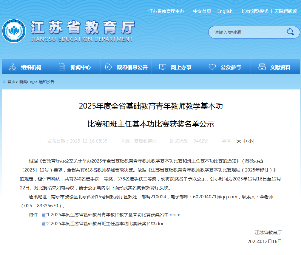 交汇点讯 记者注意到,日前,2025年江苏省基础教育青年教师教学基本功比赛和班主任基本功比赛获奖名单,正式向社会公示。