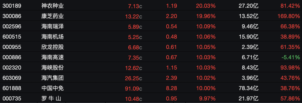 截至12月22日A股收盘,海南自贸港指数内,包括神农种业(300189.SZ)、康芝药业(300086.SZ)、海南机场(600515.SH)、海南高速(000886.SZ)、中国中免(601888.SH)、凯撒旅业(000796.SZ)、海航控股(600221.SH)等在内的15个成分股涨停。