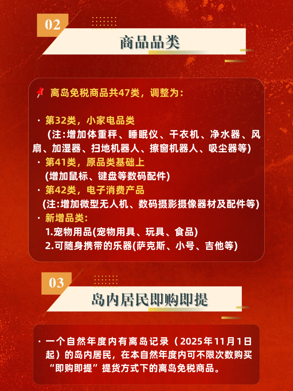 与此同时一个自然年度内有离岛记录(2025年11月1日起)的岛内居民,在本自然年度内可不限次数购买“即购即提”提货方式下的15类单价不超过2万元(不含)的免税商品,年度购物额度不超过10万元。