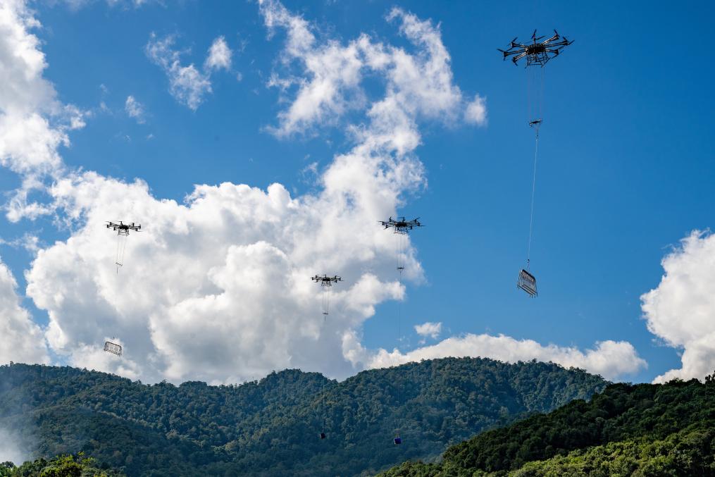 针对大重量运输难题,团队研发出“四机联吊”技术,经过数百次试验调试,攻克多机协同控制、载荷均衡分配等关键技术。目前,“四机联吊”单次运输重量已突破500公斤,创造了单日飞跃高差220米、运输直线距离900米的雨林运输纪录。