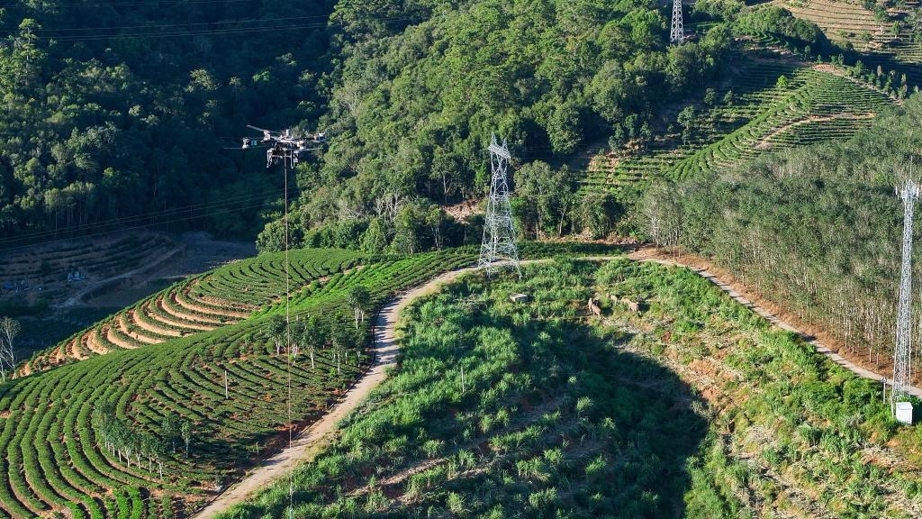 清晨的雨林上空还带着薄雾,一架重载无人机吊着塔材缓慢上升,叶片掠过树梢时激起阵阵气流。林缘处,几头亚洲象正低头翻拣着嫩叶,忽明忽暗的机械声从空中传来,它们只是抬头看了一眼,又继续觅食。