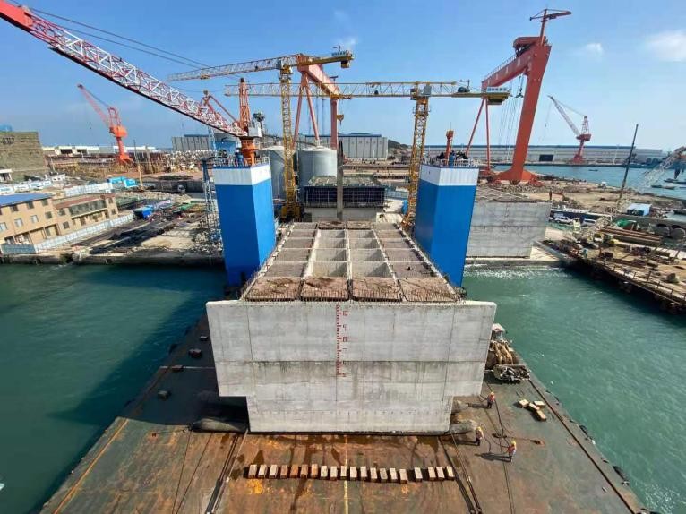 凭借成熟的沉箱出运安装技术,中建筑港装备工程公司已深度参与国内多项重大工程建设,包括烟台龙口港、青岛董家口港、江苏徐圩港、女岛港升级改造等项目,其中不乏国家深海基地、国家科考基地等科研基础设施建设以及青岛东方影都等民用项目。这些由沉箱构筑的码头如钢铁长城般巍然屹立,不仅提升了港口通航能力、保障了科研探索需求,更成为推动沿海经济发展和国家海洋战略实施的重要支撑。