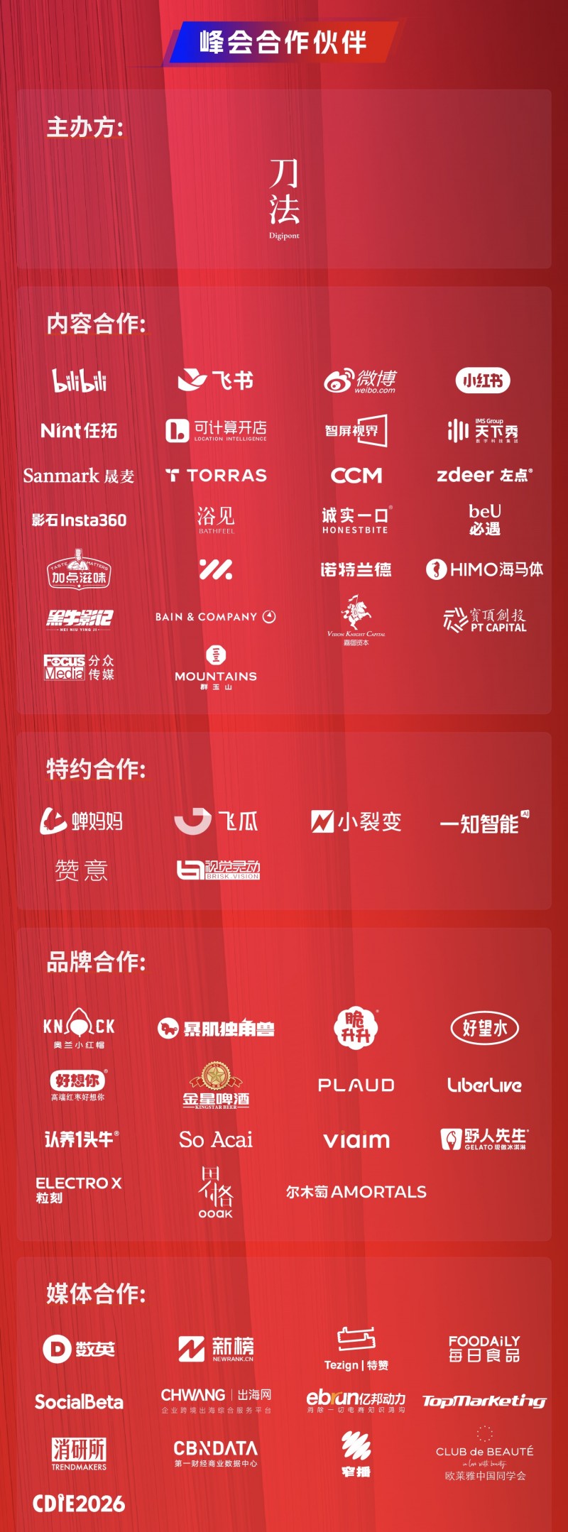 媒体合作伙伴:数英、新榜、特赞、每日食品、SocialBeta、出海网、亿邦动力、TopMarking、消研所、第一财经商业数据中心、窄播、欧莱雅中国同学会、CDIE2026。