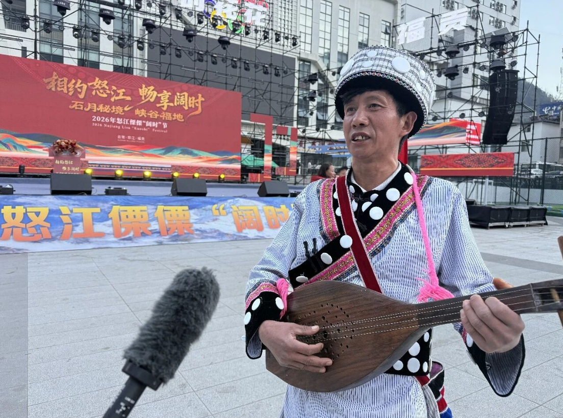 省级非遗项目“期奔”演奏县级传承人余战才:“这个像小琵琶的乐器,就是我们傈僳族的‘期奔’。它的声音能模仿鸟鸣、流水,也能诉说喜怒哀乐。以前在山上放羊、走路、谈恋爱,都离不开它。如今能在这么盛大的舞台上,和这么多年轻人一起为阔时节演奏,心里特别高兴。感觉我们的老传统,真的焕发出了新生命。”