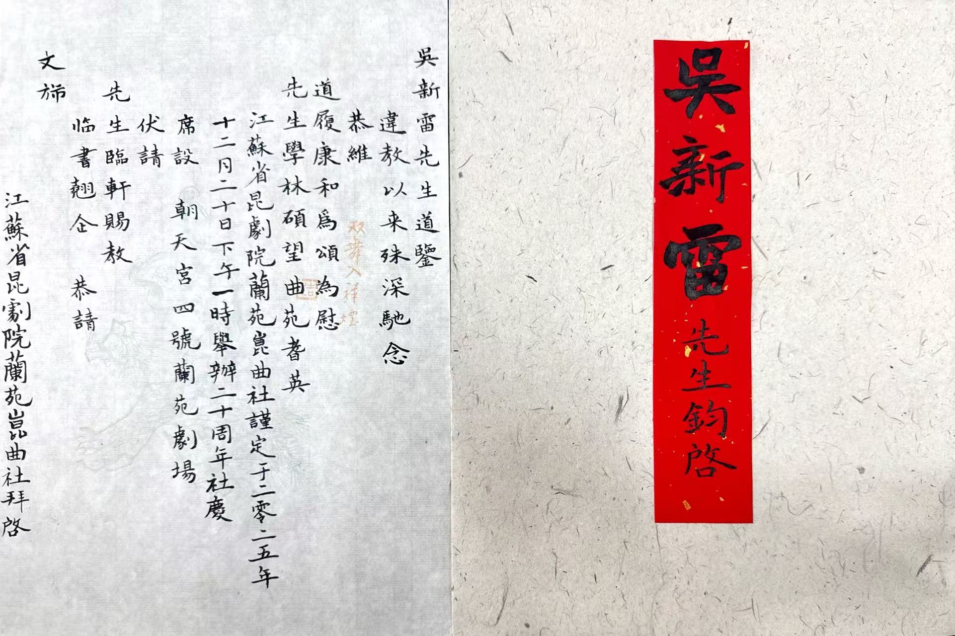 更多的还有来自全体曲友与志愿者的同心协力。作为曲会主要策划人之一,兰苑昆曲社副社长张庆晓感慨万千:“办活动对松散的社会团体来说难度不小,全靠大家拧成一股绳。”从前期用毛笔书写剧目水牌与邀请函的传统雅事,到演出期间的岗位分工,志愿者们各展所长、各司其职,曲友崔璨包揽首场水牌与邀请函书法,徐庆庆则负责第三、四场水牌书写,让传统美学在细节中彰显。前任老社长吴世明因年事已高,身体欠安未能到场,也总是心系曲社,开幕式当天还特意发来了音频祝福曲社。