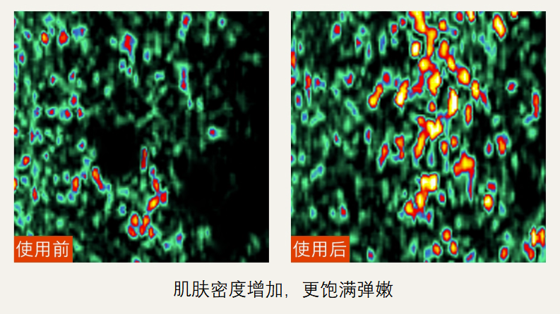 报告显示,受试者连续使用28天后,通过仪器探头测量皮肤密度,结果显示有抗皱和改善真皮密度的效果。