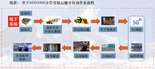 应用场景方面,该系统主要应用于华泰龙公司井下 4450 和 4400 分层的有轨运输全自动远程控制。开采环节中,通过对采区进行中深孔爆破作业,铲运机将爆破后的矿石运输至溜井,自动放矿至电机车机斗,再由井下电机车将矿石转运至皮带系统,最终送达选厂进行加工。整个作业流程依托先进的远程控制技术和高速稳定的 5G 网络,操作人员可实时监控和指挥电机车运行。