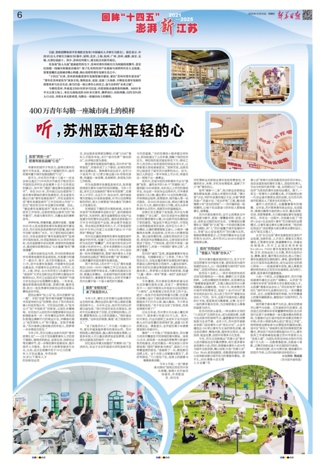 “十四五”以来,苏州系统推进青年发展型城市建设,紧扣“苏州对青年更友好”“青年在苏州更有为”两条主线,聚焦宜业、宜居、宜游三大场景,不断优化青年发展的政策体系与社会生态,着力打造一座让青年心向往之、奋斗出彩的“未来之城”。