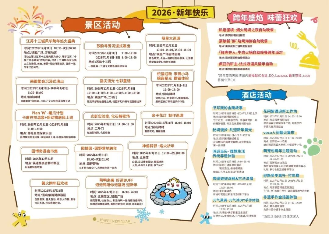 汤山温泉旅游度假区:举办“江苏十三城风华”烟火盛典,“神兽辟邪・焰火祈年”活动,“苏韵寻芳”沉浸式演出,自然探索乐园“Plan‘W’—暖爪计划”,泡着温泉看烟花。
