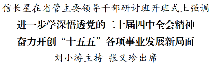 交汇点讯 12月25日,省管主要领导干部学习贯彻习近平新时代中国特色社会主义思想和党的二十届四中全会精神研讨班在省委党校开班。省委书记信长星出席开班式并讲话。他强调,要把学习贯彻党的二十届四中全会精神进一步引向深入,进一步学深悟透,进一步增强政治自觉、思想自觉和行动自觉,不折不扣落实好党中央决策部署,奋力开创“十五五”时期江苏各项事业发展新局面。省长刘小涛主持开班式。省政协主席张义珍出席开班式。