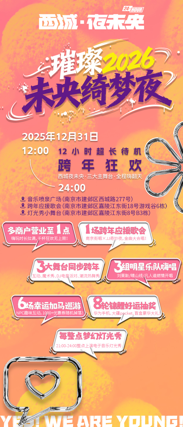 今年的南京迎新夜,无需纠结选择,西城夜未央运动街区“璀璨2026·未央绮梦夜”,就等你了!