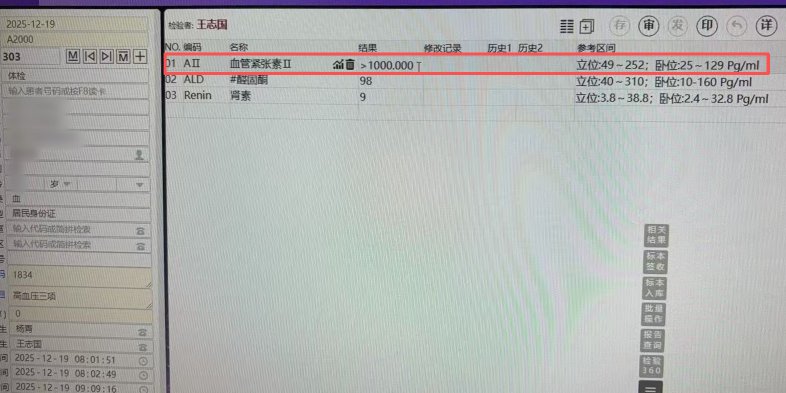 免疫室副主任技师麻全慧回忆,几天前,科室电脑屏幕上突然跳出红色警报:一份体检样本的血管紧张素Ⅱ检测值超过1000pg/ml。而正常情况下,这个数值不应超过252pg/ml(参考范围上限)。“这个结果很反常。”麻全慧说,“如果血管紧张素Ⅱ真的这么高,患者可能会有高血压、低血钾等症状,但这份报告显示其他相关指标都完全正常。”检验团队立即启动核查程序:原样复测、检查仪器状态、排除操作失误……所有常规检查都显示一切正常,但那个刺眼的“>1000”依然存在。