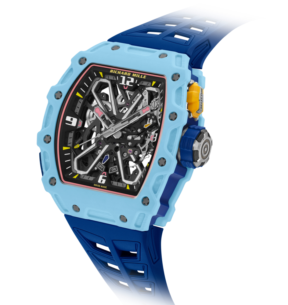RM 35-03 Rafael Nadal则将柔和的淡蓝与鲑鱼色并置,仿佛一场速度与平衡的对弈。那柔和的色彩背后,是极为复杂的热压与层叠工艺。表壳的色彩通过热压与多层纤维叠合实现,微小的偏差都会改变层理的光感。其搭载专利蝶形摆陀系统,佩戴者可一键切换上链模式,在“ON”与“OFF”之间自由切换。这种机械的逻辑,也是对生活的隐喻,仿佛“上善若水,柔中带刚”,助藏家在紧绷与松弛、控制与放手之间,找到个人的节奏。