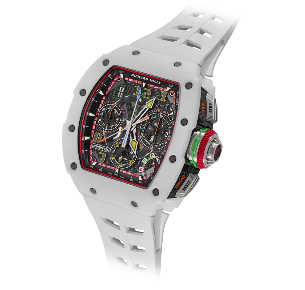 RM 65-01双秒追针自动上链计时码表的White Quartz TPT®则是一种更极致的“留白”之美。白色并非空无,而是最为克制的显现。它的机芯是理查米尔最复杂的追针计时系统之一,却在视觉上近乎静默。白色让复杂的结构显得更清晰、更纯粹,像一座由光构成的建筑,让所有的外部力量都被隐藏,只留下工艺巅峰的律动与呼吸。