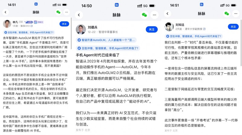 近日,脉脉《AI圆桌π对》栏目第二期上线,核心议题为“豆包冲锋、智谱掀桌,手机Agent时代来临了?”脉脉创始人兼CEO林凡认为,第一台AI手机出现在中国而不是美国,原因在于中国还有敢自我革命的非巨头手机厂商。未来市场对AI人才的需求,3年内会再增加十倍。智谱董事长刘德兵认为,手机Agent时代已经来临。清华大学计算机系长聘副教授刘知远预测,未来,与智能体的对话界面会成为比操作系统更重要的入口。