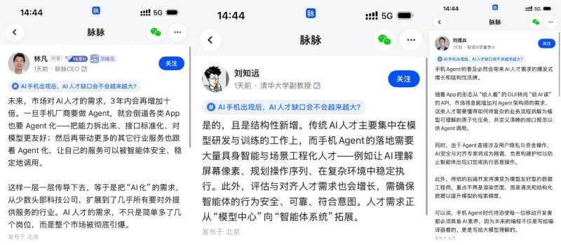 脉脉内容中心副总裁、社区负责人张喆透露,《AI 圆桌π对》栏目是脉脉社区11月上线的全新高端对话栏目,致力于从热点话题切入,融汇大咖观点、专业解读与社区投票,由浅入深构建多元化的AI内容体系。首期议题“AI人才接连离职,是Meta的失误决策吗”揭示了全球竞争下的技术路线分歧。第二期则重点关注AI手机和由此带来的人才供需变化。未来,脉脉将持续聚焦AI关键议题,汇聚专家观点与真实职场声音,呈现AI快速演进中的多元图景。