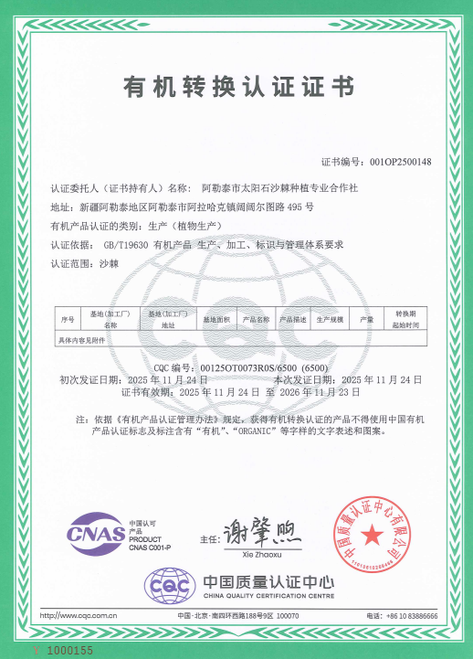 生态产业若想行稳致远,离不开标准化的品质支撑。2025年,垦荒先锋推动阿勒泰市太阳石沙棘种植专业合作社正式获得有机转换认证证书。该认证严格遵循国家标准GB/T19630,标志着企业将生态责任深植于产业链源头,为沙棘产业的高质量发展树立了绿色标杆。
