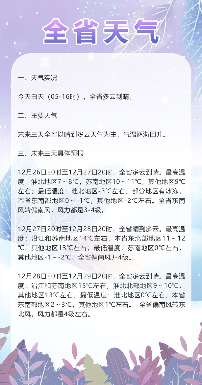12月26日20时至12月27日20时,全省多云到晴,最高温度淮北地区7~8℃,苏南地区10~11℃,其他地区9℃左右;最低温度淮北地区-3℃左右,部分地区有冰冻,本省东南部地区0~-1℃,其他地区-2℃左右;全省东南风转偏南风,风力均为3—4级。
