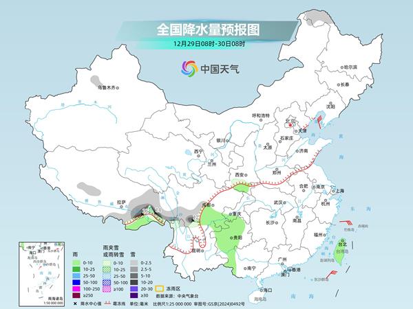 预计30日夜间开始,随着暖湿气流增强,西藏东部、四川、贵州、重庆、陕西南部、湖北西部等地降水又会发展增多。之后,水汽继续向东、向北输送,黄河以南地区将出现一轮“跨年”降水。目前来看这轮降水范围广,但强度不大,多是小到中雨雪量级。公众需密切关注临近预报,做好相关防范措施。