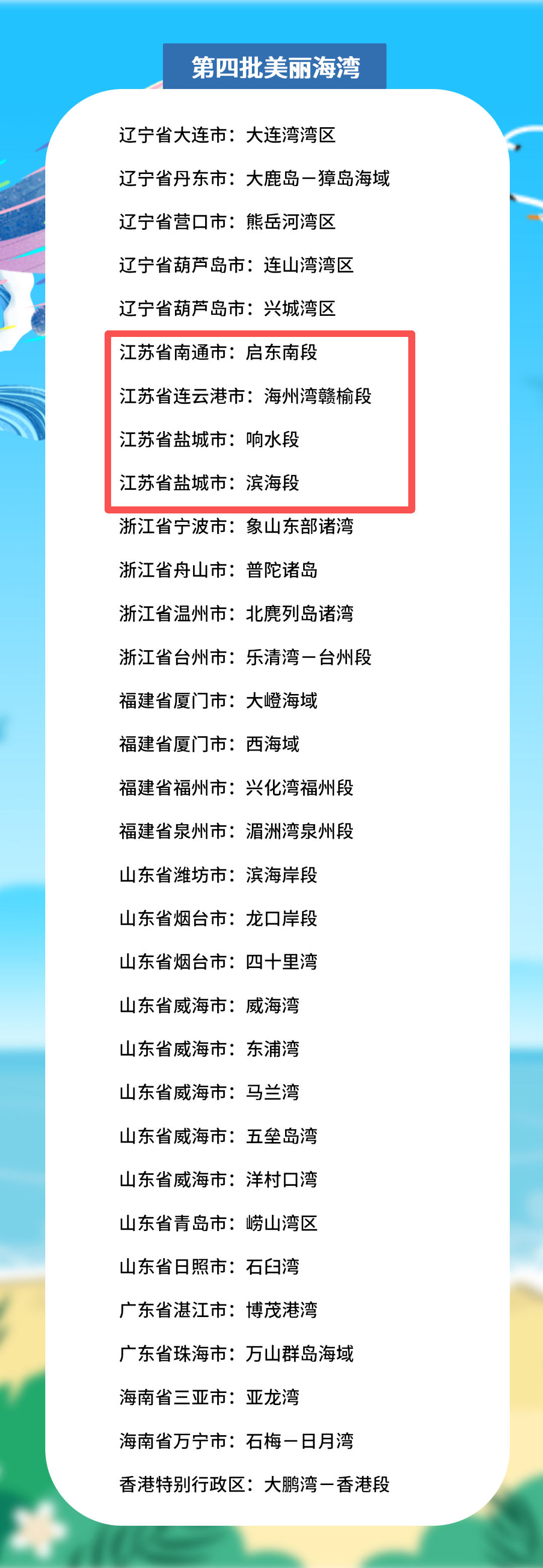交汇点讯 12月26日,生态环境部发布第四批美丽海湾优秀案例和美丽海湾名单,江苏南通市启东南段、连云港市海州湾赣榆段、盐城市响水段、盐城市滨海段获评美丽海湾。