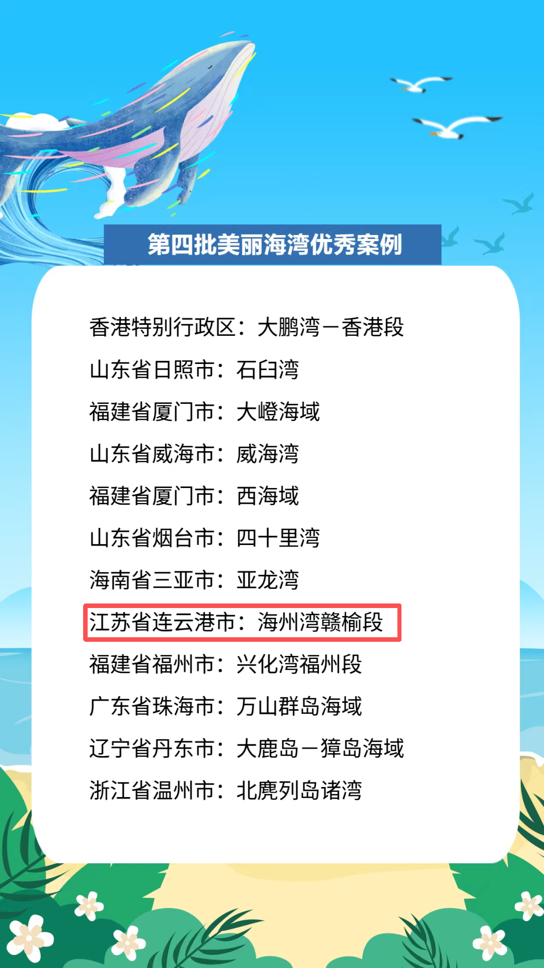 其中,美丽海湾优秀案例全国共选出12个,连云港市海州湾赣榆段入选。
