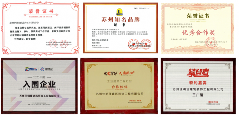 如今,佳明佳建筑装饰拥有国家装饰机电消防二级施工资质,通过质量、环境及职业健康管理体系认证。并荣获多项荣誉,包括重质量重合同重服务企业、国家高新技术企业、国家科技型中小企业、江苏省民营科技企业、苏州创新型企业以及苏州知名品牌等。王广清也应邀做客CCTV《大国匠心》、《攀登者》等节目,分享企业心得,行业影响力持续提升。