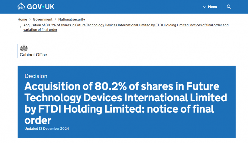 FTDI是全球USB桥接芯片领域的核心领军企业,其产品广泛应用于电动汽车、IoT互联网、工业控制、医疗设备及电池充电等领域。2021年12月,因看中FTDI在芯片、软件和标准方面的优势,弥补国内在高端接口芯片领域的空白,中国建广资产耗资4.14亿美元,通过注册在英国的中资企业FTDI Holding Ltd(简称FTDIHL)收购了FTDI 80.2%的股权。这笔在正常商业与法律框架下完成的交易,却在近三年经营初显成效后,被迫强制出售,引发争议。