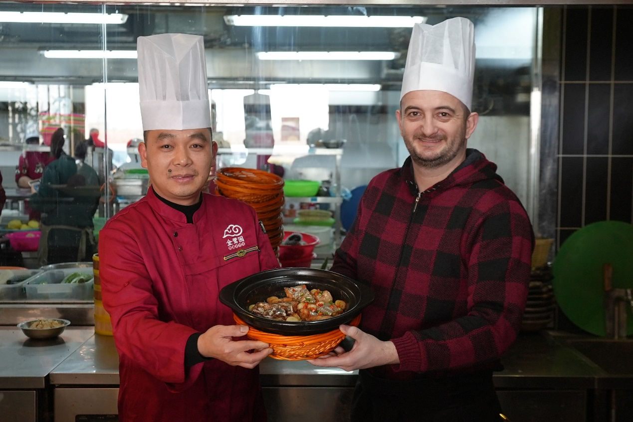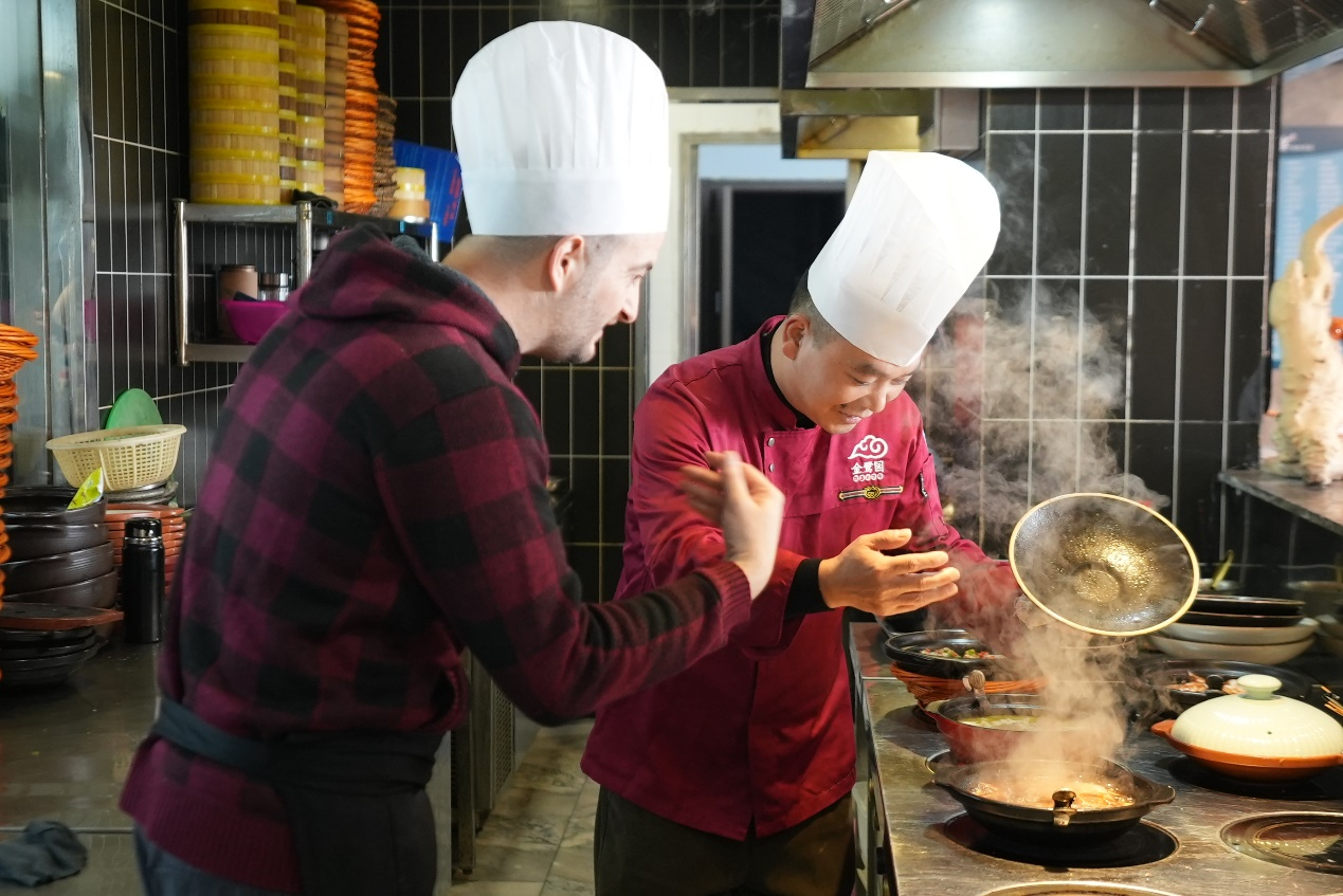 这个时节的带鱼,脂肪丰厚、刺少肉嫩,被称为“带鱼中的爱马仕”,简单油浸便鲜香四溢。在法国从事了20多年厨师工作的维维安现场与本地大厨学艺,亲手烹制油浸带鱼。语言不通没关系,中法大厨间的交流靠比划便流畅自如。当肥美的带鱼在油中泛起金黄,鲜、香、滑、嫩聚于一身,维维安的眼睛都亮了。