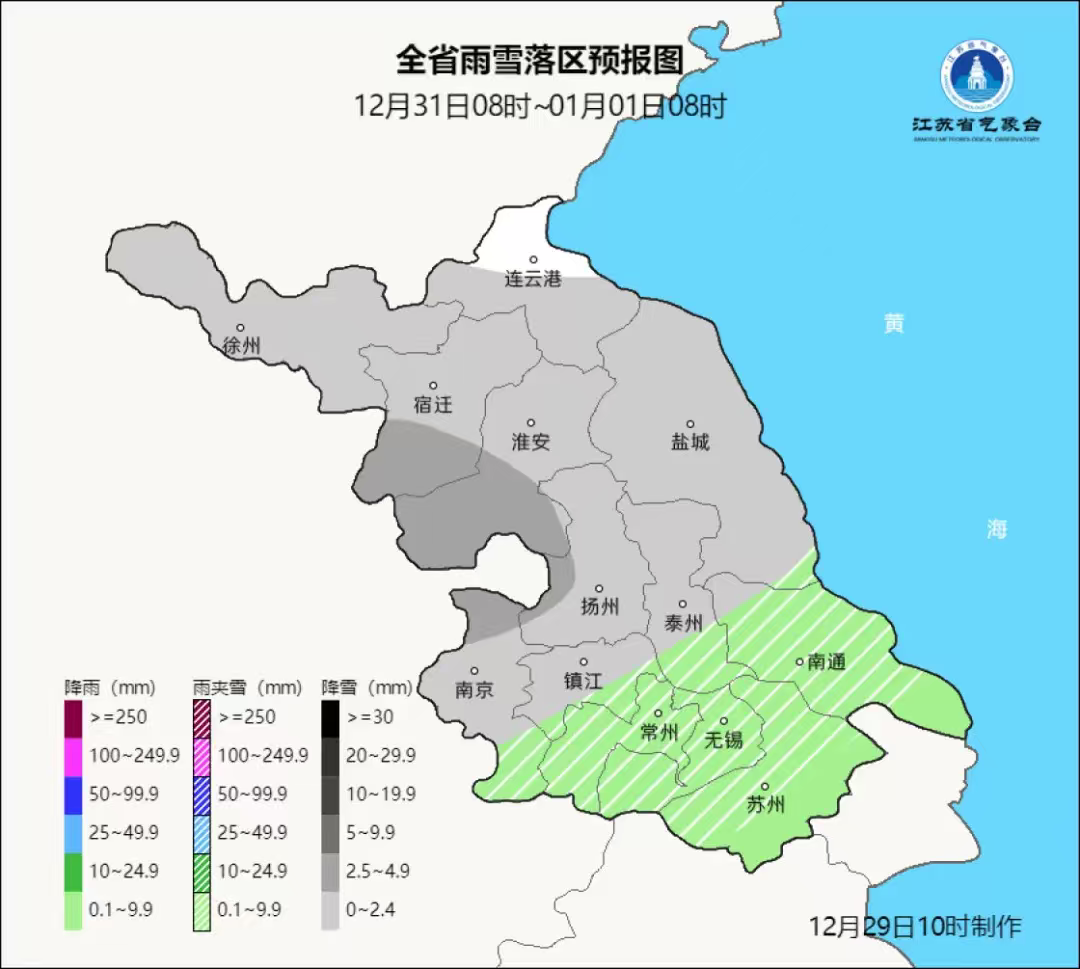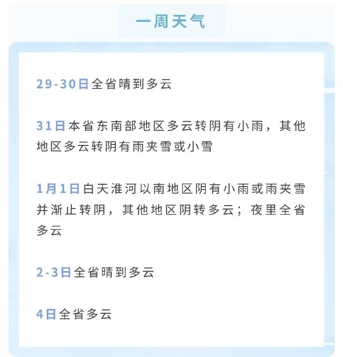 具体天气预报如下:29—30日,全省晴到多云;31日,本省东南部地区多云转阴有小雨,其他地区多云转阴有雨夹雪或小雪;2026年1月1日,白天淮河以南地区阴有小雨或雨夹雪并渐止转阴,其他地区阴转多云,夜里全省多云;2—3日,全省晴到多云;4日,全省多云。2025年12月30日夜里—2026年1月1日,全省迎来较强冷空气,大部分地区48小时最低气温降幅可达5~7℃;1月2—3日,沿淮和淮北地区最低气温-5~-6℃,本省东南部地区-1~-3℃,其他地区-3~-5℃,全省大部分地区出现冰冻。2025年12月31日—2026年1月1日,陆上阵风可达5~7级;2025年12月31日—2026年1月2日,沿海海面阵风可达6~8级。
