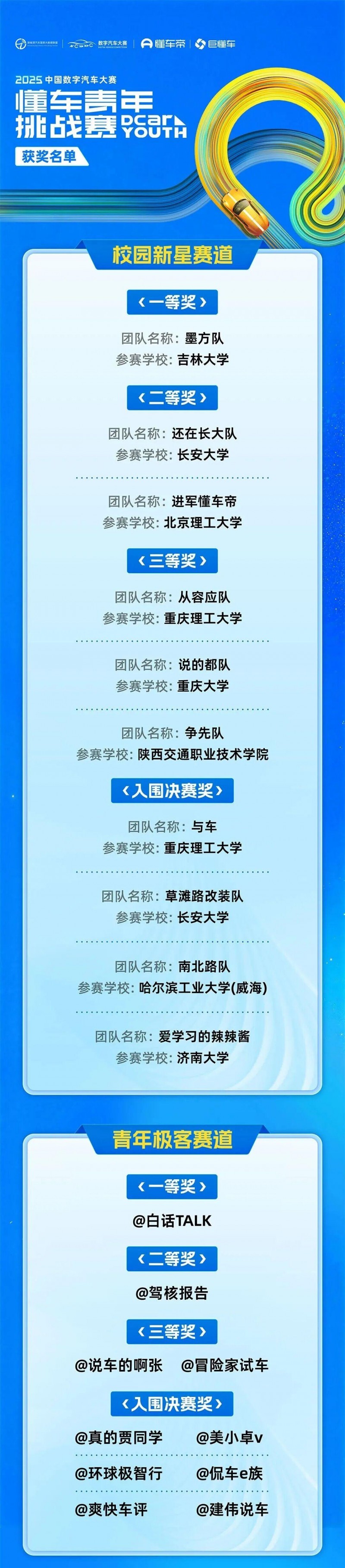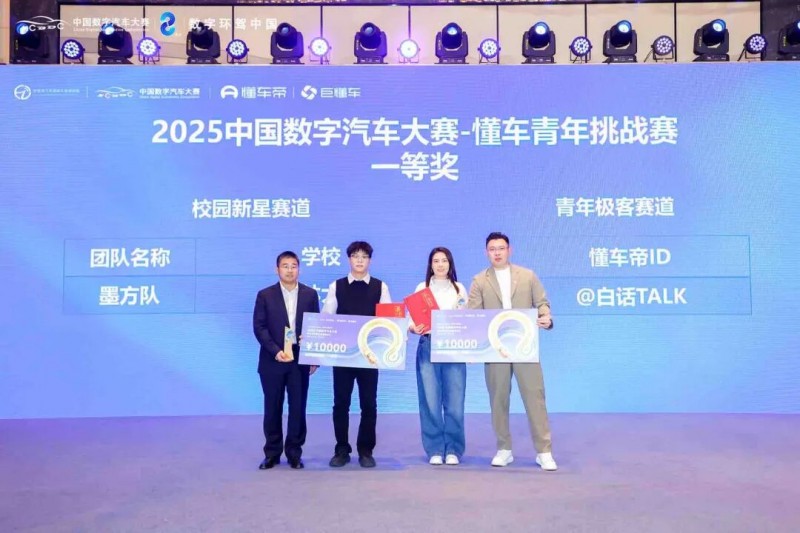 12月28日,“Driving the Future”2025中国数字汽车大赛懂车青年挑战赛颁奖典礼在天津市武清区圆满举行。经过长达半年的角逐,迎来了激动人心的颁奖时刻,校园新星赛道与青年极客赛道的一、二、三等奖获奖团队代表来到现场接受了大赛组委会的颁奖。