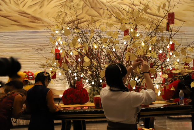 最让人动容的,莫过于许愿树祈福仪式这一全新亮点环节。酒店精心打造了高达2 米的特色风格许愿树,树枝上悬挂着镂空纹样装饰牌,树下整齐摆放着印有吉祥八宝图案的精美祝福卡片与笔墨。宾客们纷纷驻足,写下对家人的思念、对来年的期许,或是对高原大地的美好祝愿,再亲手将卡片系于枝头。当姬楚总经理与嘉宾们共同挂上象征 “国泰民安、喜乐常伴” 的主祝福牌时,现场响起阵阵掌声,许愿树在灯光映照下熠熠生辉,既延续了高原文化中祈福纳祥的传统,更呼应了万达酒店及度假村 “以冬至为媒,传递情感共鸣” 的品牌主张,所有的寒意都被这份真挚的期许驱散,只剩下满心的温暖与感动。