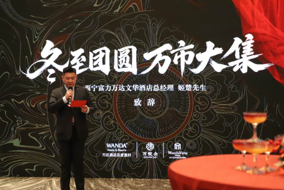 随着暮色渐浓,欢快的锅庄舞准时登场。酒店员工身着特色服饰,踩着明快的节奏起舞,灵动的身姿瞬间点燃现场气氛。当主持人邀请西宁富力万达文华酒店总经理姬楚先生上台致辞时,他特别提及:“作为万达酒店及度假村冬至联动活动的一环,我们既要延续‘暄和万集’的文化基因,更要让高原特色成为这场全国文化盛宴的独特注脚。” 这番话既呼应了集团 “弘扬中华传统民俗文化” 的初衷,也道出了酒店传承本土文化、打造优质体验的初心。随后上海援青办领导的发言,更让这场活动多了份携手共进的深意,为 2026 年的美好合作拉开了序幕。