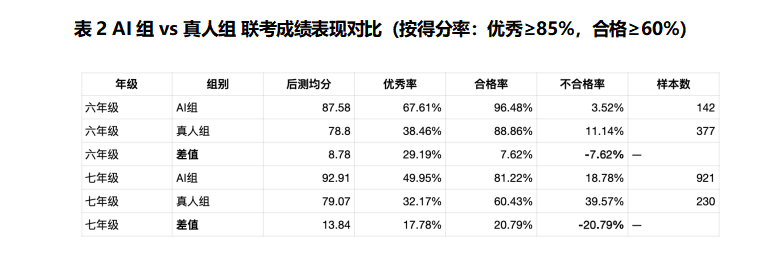 本次挑战联合艾瑞咨询开展实证研究,覆盖五所学校六年级与七年级共1662名学生。数据显示,采用松鼠Ai智适应系统的教学组,在平均成绩、优秀率等多个维度上表现优于传统教学组。此次实验不仅是一次规模化的教学效果对比,也体现了松鼠Ai基于自研多模态智适应教育大模型的技术能力,为AI教育从工具应用到成效验证提供了具有参考意义的实践案例。