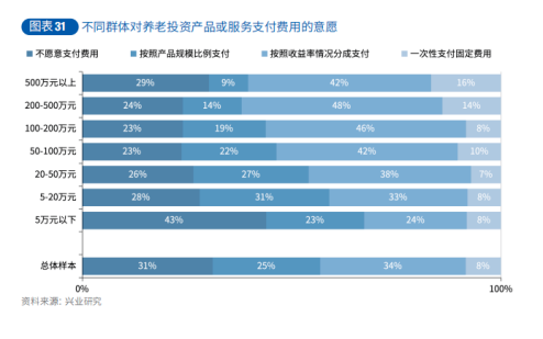从养老金融产品的配置意向来看,银行系“存款 + 理财”产品是各类型人群的配置基础,对商业保险产品的认可度在中青年群体中逐步渗透,高收入人群则倾向通过股票、信托、债券等产品构建更加多元的资产组合。从产品特征来看,当前居民对养老金融产品需求总体呈现“安全垫优先、收益预期理性、流动性敏感”的核心特征。除此之外,税惠政策、投资范围以及发行机构资质也是投资者选择养老金融产品时较为关注的要素。从产品收费模式来看,受访者期望按照业绩来确定支付费用的倾向显著,财富管理规模越大的人群对于费用的敏感度相对较低。