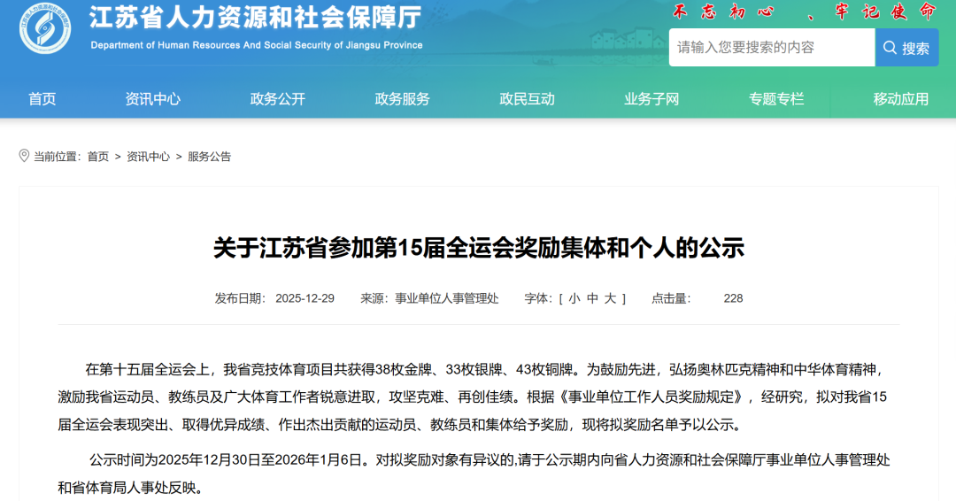 公示时间为2025年12月30日至2026年1月6日。对拟奖励对象有异议的,请于公示期内向省人力资源和社会保障厅事业单位人事管理处和省体育局人事处反映。