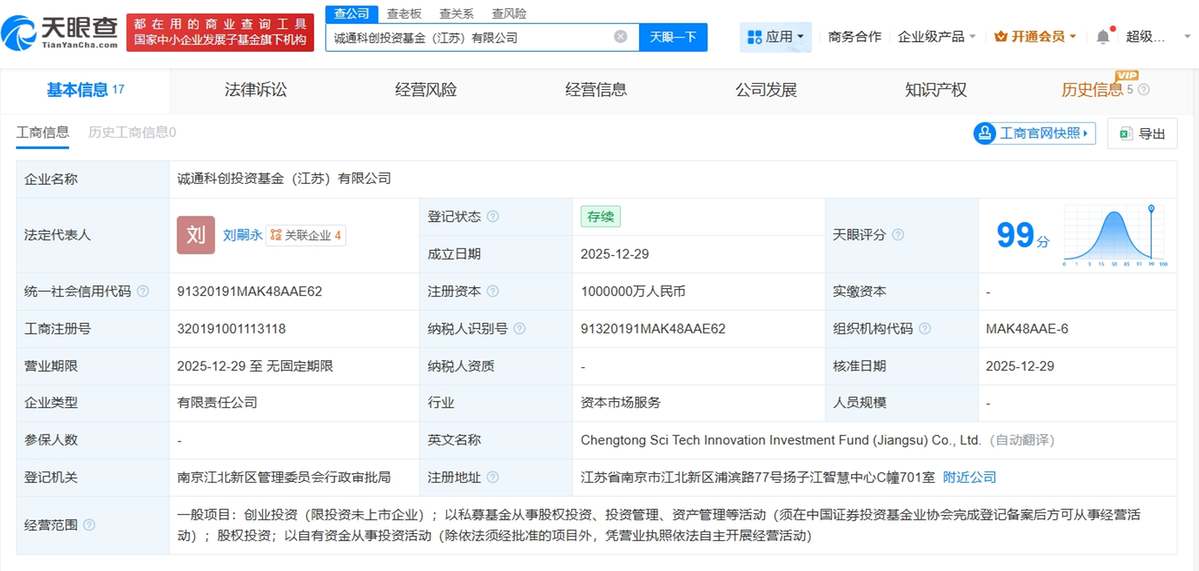 新华日报财经讯 近日,企查查显示,诚通科创投资基金(江苏)有限公司成立,出资额100亿元,经营范围包含:创业投资(限投资未上市企业);以私募基金从事股权投资、投资管理、资产管理等活动。企查查股权穿透显示,该企业由中国诚通控股集团有限公司(以下简称中国诚通)、江苏省战略性新兴产业母基金有限公司、联通创新创业投资有限公司等共同持股。