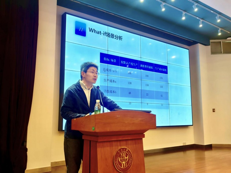 汪达钦教授则以《供应链优化技术与企业实践》为题,表示AI能基于海量数据快速完成多维度What-if模拟分析,例如聚焦生产模式选择的平衡问题,通过对履约率优先、成本优先、减少换型三个场景的量化分析,展示了不同场景下及时履约率、库存成本、换型成本等核心指标的差异,为生产决策提供数据支撑。