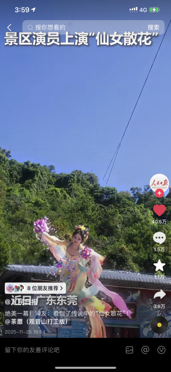 这一幕,出自东莞观音山的“飞天神女”表演。目前全网火爆。早在今年11月东莞观音山仙侠会上,“天女散花”表演被许多游客拍下,其中一条视频被《人民日报》转载,旋即火遍全网,环球网、海外网等央媒纷纷跟进转发。如今全网累计浏览量超过5000万,单条视频点赞超两百万。“观音山飞天神女”一度上榜全网热搜,有网友留言:“这才是传统文化正确的打开方式!” “美成了神话故事的模样!”