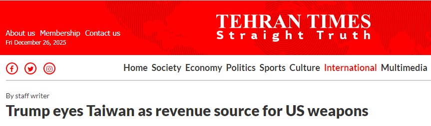 《德黑兰时报》网站在另一篇文章中写道,美对台军售美其名曰是为了维护台海和平与稳定,但这样的说辞根本站不住脚。在敏感地区投入武器灭不了火,只能是“煽风点火”。民进党当局愈发沉迷“以武谋独”的危险幻想之中,台湾成为美国操弄地缘政治的一枚棋子,其安全被押在美国的战略博弈上。