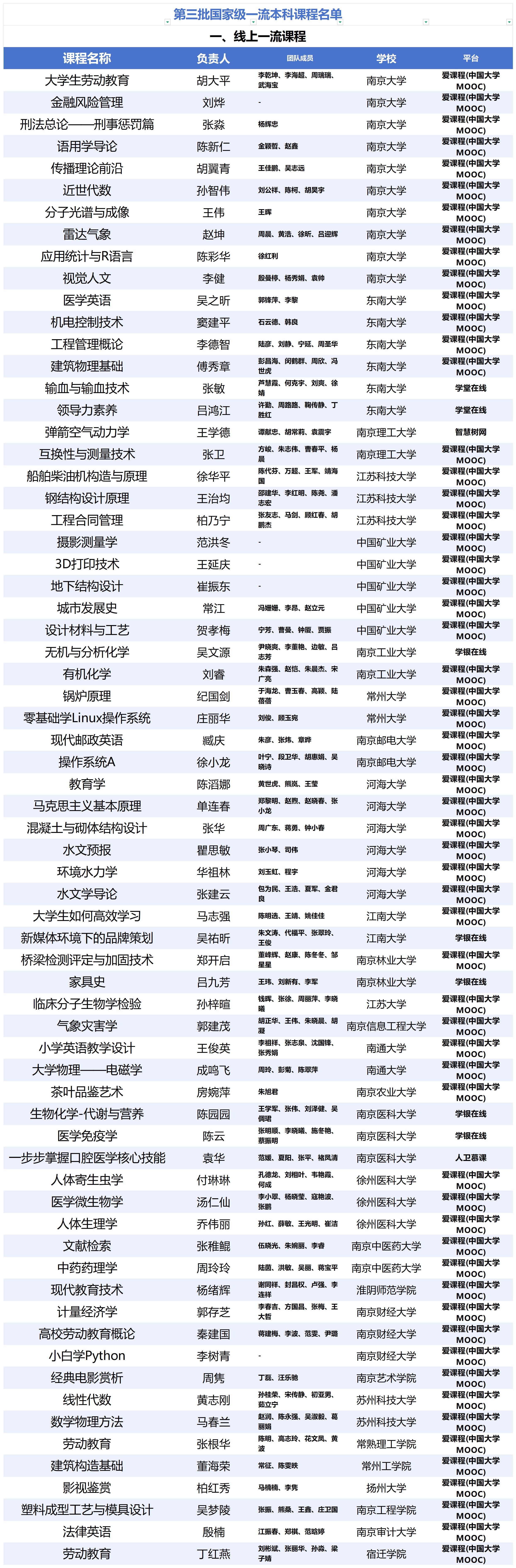 交汇点讯 近日,教育部公布第三批国家级一流本科课程名单,共有5994门课程获认定,其中包括线上课程1000门,虚拟仿真实验教学课程500门,线下课程1841门,线上线下混合式课程2204门,社会实践课程449门。其中,江苏入选课程具有学校多、学科覆盖广、行业适配性强等特点。江苏有哪些课程入选国家级一流本科课程?一起来看——