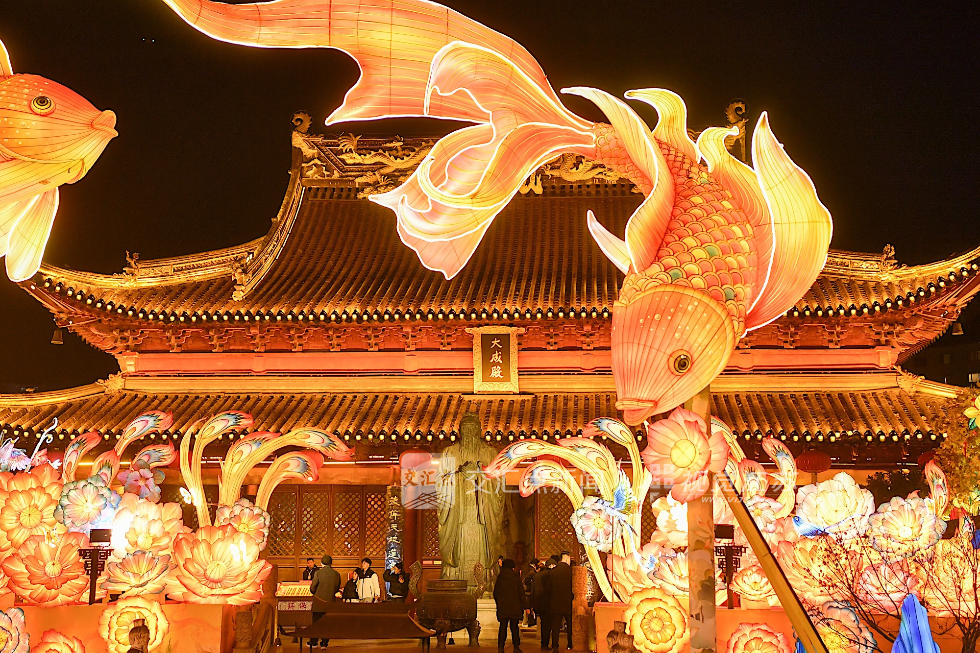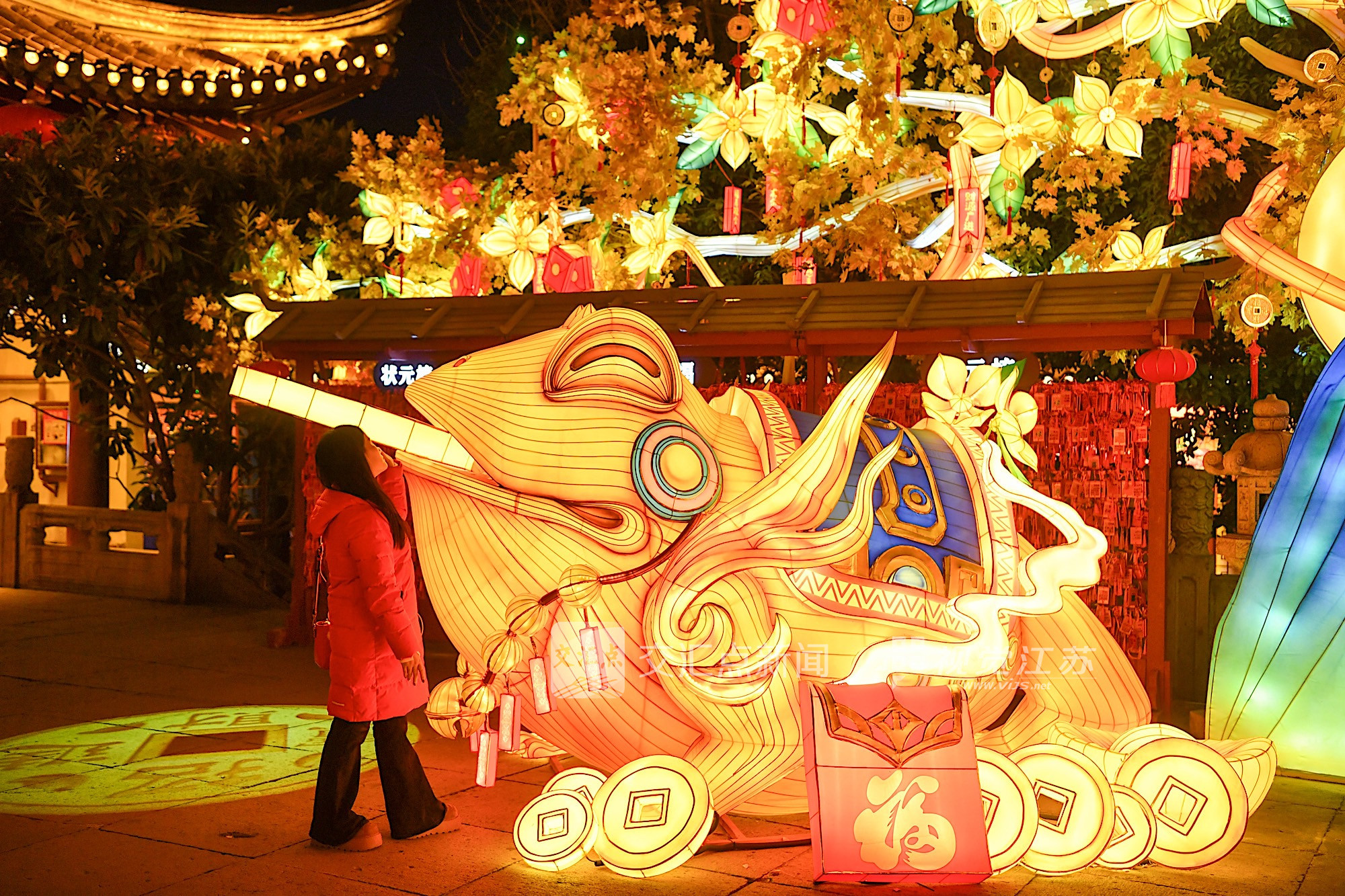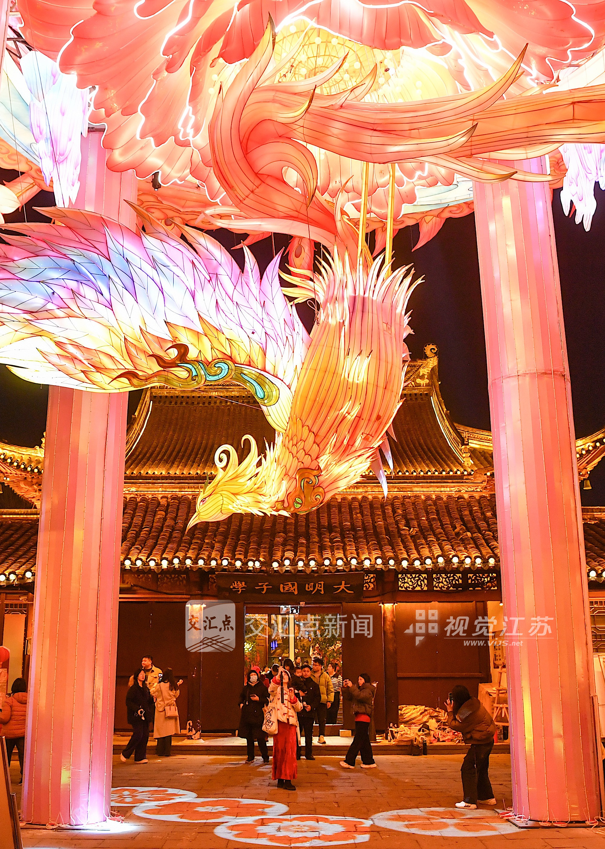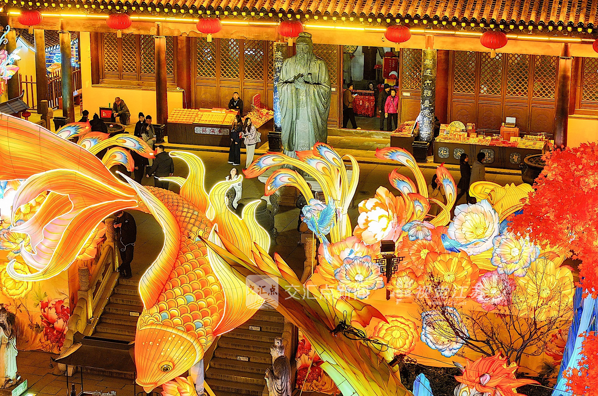 12月30日晚,第四十届中国·秦淮灯会主会场夫子庙大成殿举行试亮灯,四大主题区域30余组灯组同时点亮,华光流转,绮丽初绽。