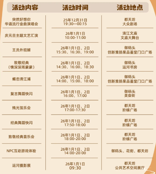 激光秀、跨年倒计时、千里江山、烟花绘卷、非遗龙狮鼓舞、烟花市集、烧烤盛宴、舞台乐队