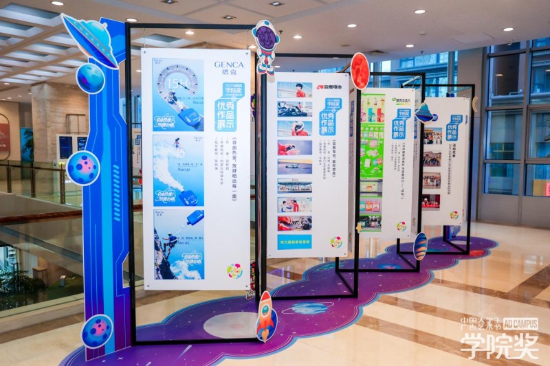 品牌展区以蓝色调为设计核心,成为现场最吸睛的打卡点。展区内还设置优秀创意作品墙,将获奖的作品进行展示,不少学生与获奖作品合影打卡。